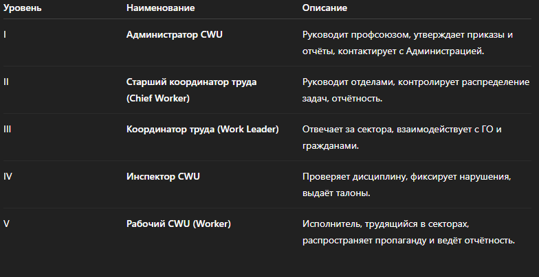 1.1. Гражданский Профсоюз Работы (CWU) — официально признанная структура Альянса, осуществляющая надзор за трудовой деятельностью населения.