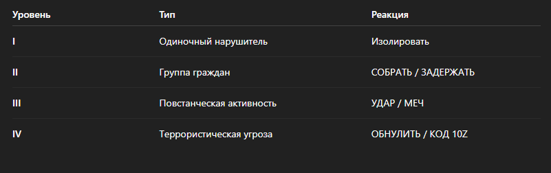 Описание: Автоматически активируется, если Сопротивление численно превосходит гражданских. Возможно введение пропускной системы, зачисток.
