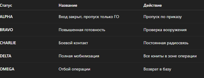 Свод оперативных кодов, обвинений, уровней нарушений и директив. Используется юнитами ГО и СЧОПА (OTA) в IC-режиме. Нарушение или несоблюдение — FailRP.